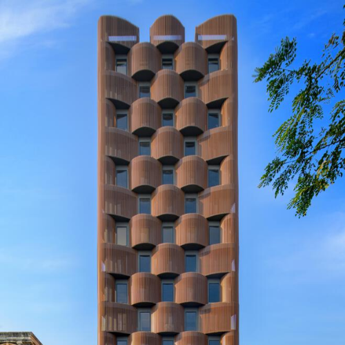 On a compact urban plot of around 836 square meters, the Stella Office Building hosts almost 5, 575 square meters of office space. Given the requirements for statutory open spaces and the small size of the site, the building was designed to rise vertically for 14 levels. Each floor is made up of four office units, thus allowing the building to be used by several tenants at the same time while making the most of the space.