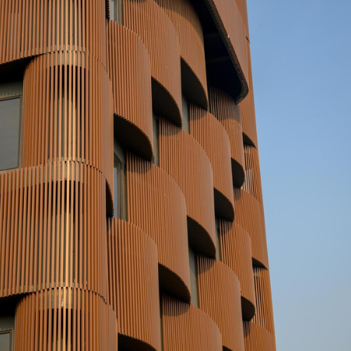 Meanwhile, besides its environment, friendly features, Stella makes a daring visual statement in Nagpur's cityscape. The undulating rhythm of half, circle, shaped elements literally brings the front to life. Diverse material palette featuring concrete, steel, aluminum louvers, and greenery creates a look that is both modern and sensitive to the climate.