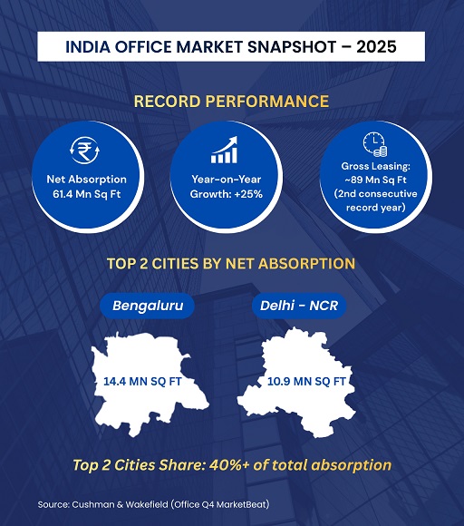 According to Cushman & Wakefield's Office Q4 MarketBeat Report, 2025, Bengaluru recorded the highest total absorption of 14.4 million sq ft, followed by Delhi NCR with a total absorption of 10.9 million sq ft, thereby constituting more than 40% of the total absorption. The remaining eight major cities of Mumbai, Hyderabad, Pune, and Chennai also recorded healthy numbers in terms of absorption levels for leases.