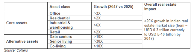 While core assets will be central to the growth story of Indian real estate, alternate assets like data centers, senior living, and co-living, have a greater headroom for growth in the coming years on account of their current nascency. India’s data center capacity is expected to scale significantly, reaching nearly 4.5 GW by 2030 and surging to 10 GW by 2047—driven by policy-level push, rising adoption of AI, cloud & edge computing, 5G rollout, and green energy integration. Senior and co-living will also see multi-fold growth driven by demographic shifts and evolving lifestyle needs. Inventory in both these segments is likely to rise at least 10X times each over the course of next few decades. Overall, as investors continue to seek newer markets and alternative avenues to diversify their portfolio while enhancing risk-adjusted returns, we are likely to witness an increase in allocation of foreign as well as domestic capital towards alternative asset classes.