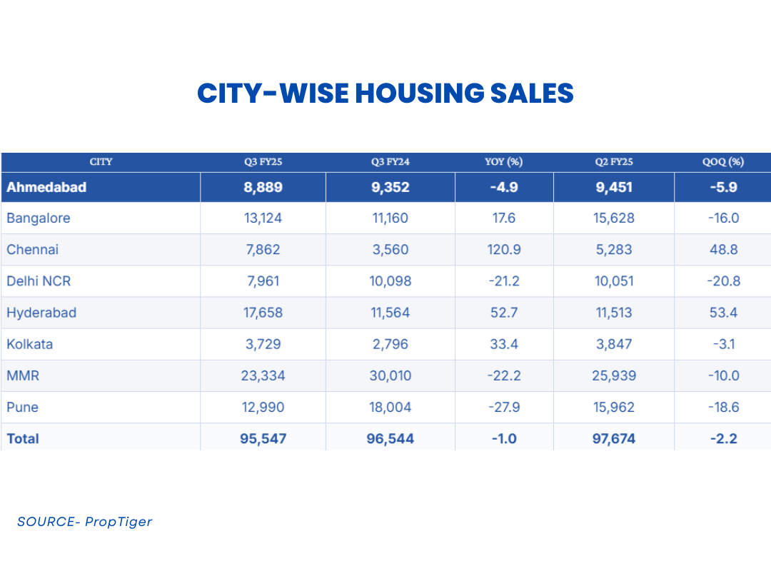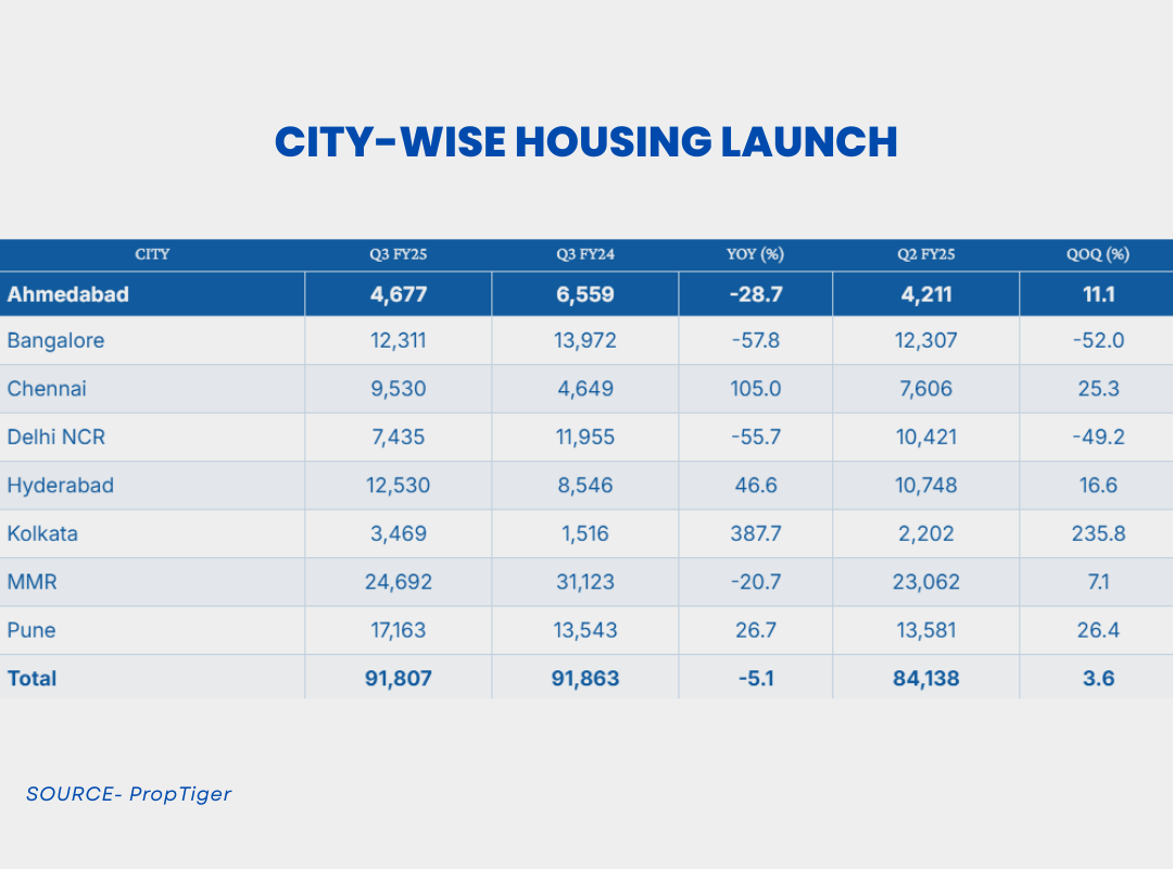 City-level sales performance highlighted this divergence further. MMR saw a sharp 22% decline in units sold, from 30,010 to 23,334 units, while Delhi-NCR recorded a 21% fall to 7,961 units. Pune also experienced a significant dip, with sales declining 28% to 12,990 units, and Ahmedabad saw a more moderate decrease of 5%, totaling 8,889 units. On the other hand, cities like Bengaluru, Hyderabad, Chennai, and Kolkata recorded strong growth: Bengaluru led with an 18% rise to 13,124 units, Hyderabad surged 53% to 17,658 units, Chennai jumped 121% to 7,862 units, and Kolkata grew 33% to 3,729 units.