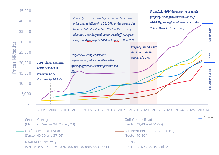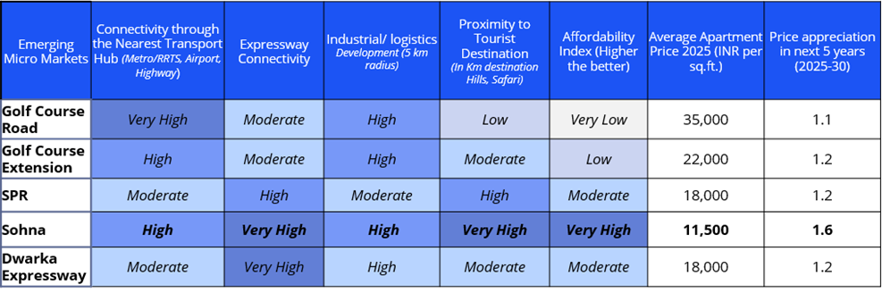 Within the National Capital Region (NCR), urbanization has been most pronounced in satellite cities such as Delhi, Gurugram, Noida, Faridabad and Ghaziabad. Among these, Gurugram has emerged as a leading hub, driven by strong in-migration of professionals and entrepreneurs, large-scale infrastructure upgrades, and luxury residential development. Its transformation began with the establishment of Maruti Suzuki in 1982, gained momentum with the first Gurugram Master Plan 2031 released in 2007, further accelerated by IT/Business Parks, Yellow line Metro expansion, Expressway connectivity and industrial development. With land availability in central Gurugram becoming saturated and commercial hubs such as Cyber City, Golf Course Road, Dwarka Expressway reaching maturity with respect to land area and price, the city’s urban footprint has steadily moved towards South of Gurugram. Which has led to the rise of new micro-markets that are witnessing growing demand for real estate activity.