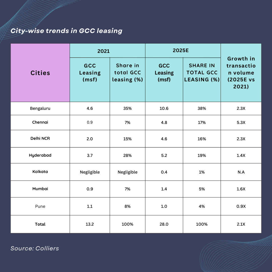 US-based companies have traditionally led the GCC demand across India’s top seven cities, accounting for nearly 70% of total GCC absorption since 2021. This dominance has been fueled by strong space take-up from global technology giants and Fortune 500 firms, which have established their offshore captive business units in India. Interestingly in recent years, GCCs from the UK, EMEA, and APAC regions have also expanded their footprint, steadily strengthening their presence in India. Of the estimated 28 million sq ft of space uptake by GCCs in 2025, around 10% is likely to come from global corporates across APAC countries such as Japan, Australia, Singapore, etc. Overall, as the Indian office market continues to grow in scale and depth, an increasingly diverse mix of occupiers from across regions are expected to establish their capability centers here, further enhancing India’s prominence in the global office landscape.