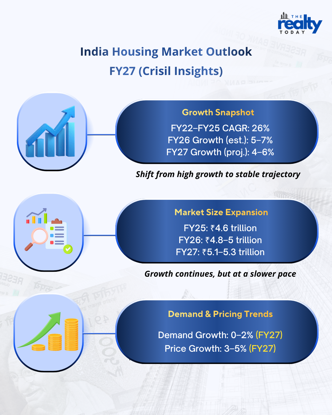 India's residential real estate sector is slowly moving towards a stable and sustainable growth phase in FY27 after a strong post-pandemic expansion. As per Crisil Ratings, growth in the value of housing sales is likely to ease a bit to 4-6% in FY27 from an estimated 5-7% in FY26. However, this moderation is more the result of a leveling off of demand and a deceleration in price rise rather than any fundamental market weakness.