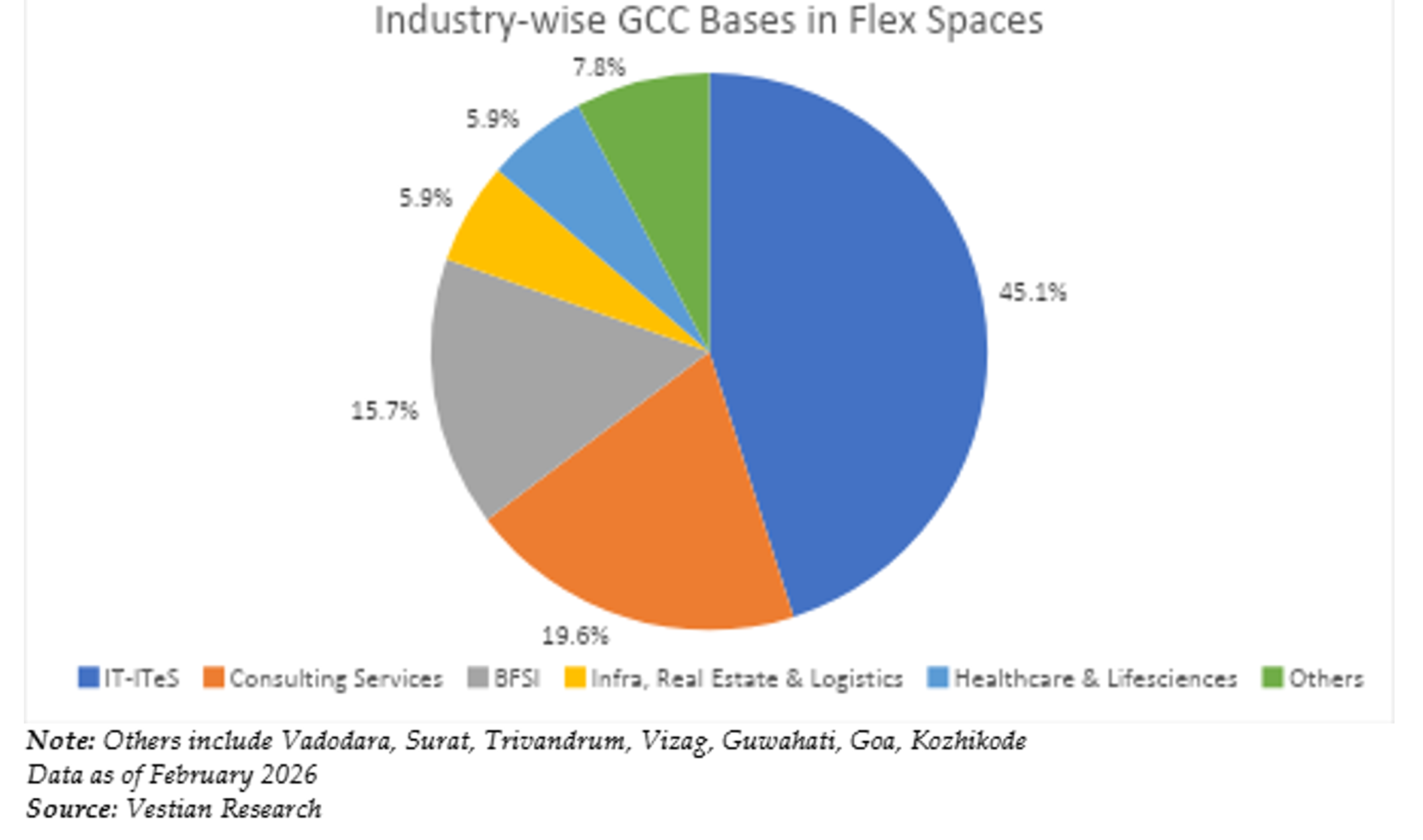 Beyond offering agile and scalable workspace solutions, flex spaces in Tier-2 cities deliver cost arbitrage of up to 50% compared to the metropolitan cities. Driven primarily by the IT-ITeS sector, followed by Consulting Services, BFSI, and Engineering & Manufacturing sectors, more than 200 companies have already established over 300 GCC bases across major Tier-2 cities.