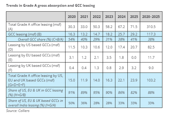 - GCCs have contributed 117 million sq. ft. of leasing since 2020, accounting for nearly 38–40% of India’s cumulative Grade A office absorption.
