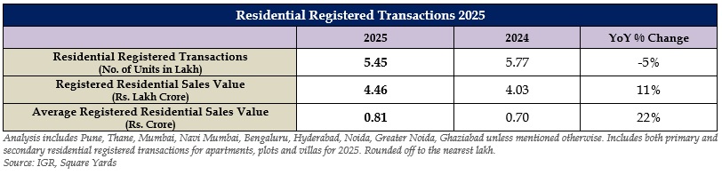 According to the report, in 2025, registered residential transactions in India’s 9 prime residential markets declined by 5% year-on year even as total sales value increased by over 11% in the same period. This growth, the report shows, is driven by a 22% increase in average deal sizes.