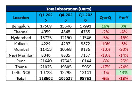 According to NSE-listed real estate data analytics company PropEquity, housing sales fell by 13% YoY and 6% QoQ to 98,761 units while launches fell by 19% YoY and 8% QoQ to 92,411 units in January-March 2026.