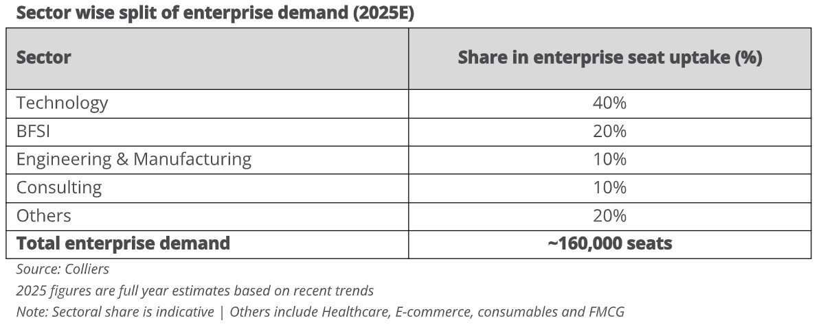 Enterprise occupiers continue to dominate India’s flex market, accounting for nearly 70% of the total flex seat demand. Average annual enterprise seat uptake has grown notably, from around 50,000 seats in 2021 to nearly 160,000 seats in 2024 and 2025, led primarily by technology and BFSI firms – these sectors cumulatively contribute around 60% of the current enterprise demand. This strong trajectory is set to continue further, with annual enterprise seat uptake expected to reach ~200,000 seats during 2026 and 2027, marking a 25% increase over the preceding two-year period. While technology and BFSI occupiers will remain the most prominent demand drivers, sectors such as engineering & manufacturing and consulting are expected to contribute more meaningfully, accounting for 10-15% of enterprise seat uptake each.