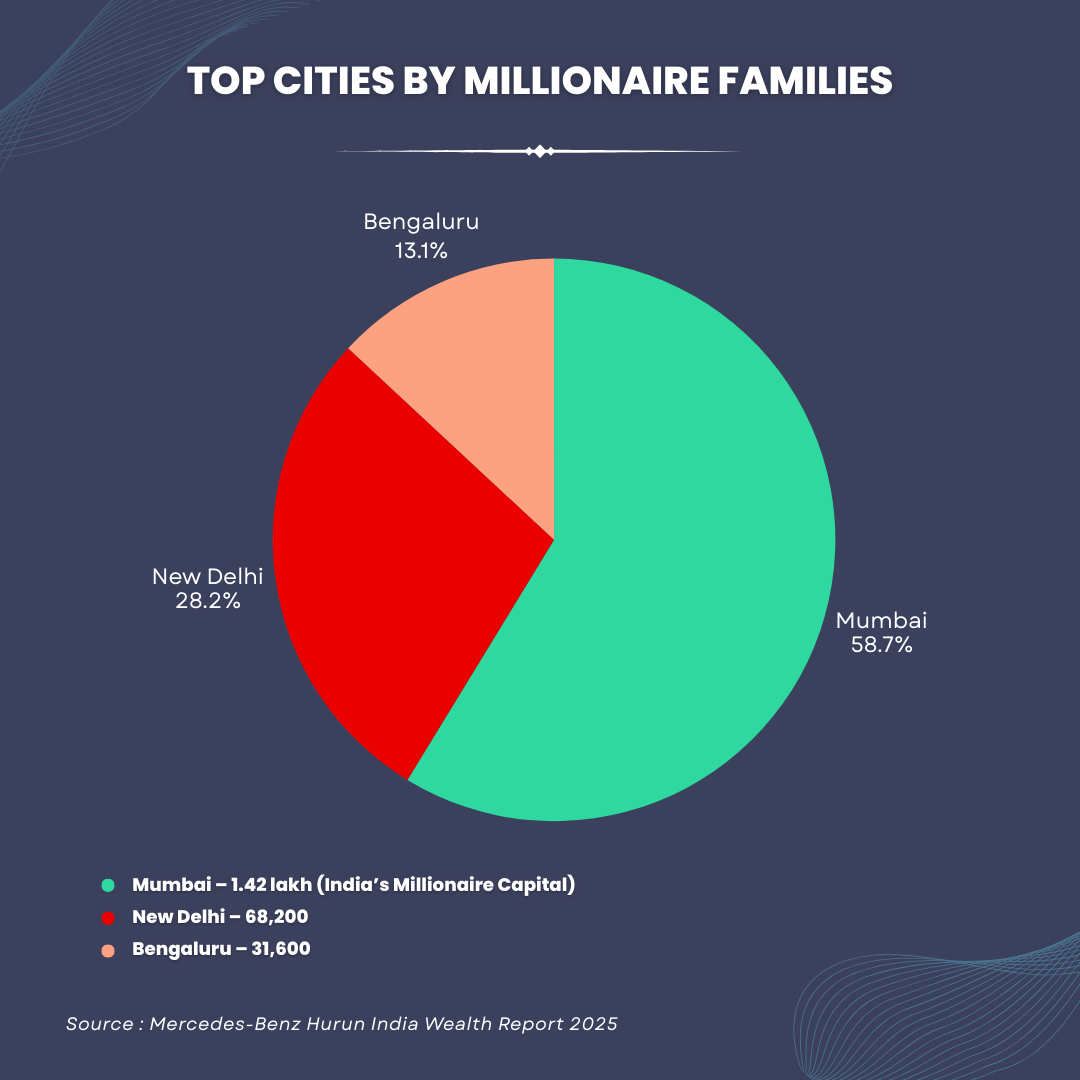 Mumbai leads the millionaire tally with 1.42 lakh families, followed by New Delhi with 68,200 households, and Bengaluru with 31,600 households. Together, these three cities form the core of India’s affluent class.