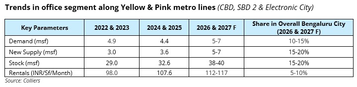 “The expansion of Bengaluru’s metro network is set to boost the city’s office market across key central & secondary business districts and peripheral locations such as Electronic City. The operational Yellow Line has already improved connectivity to Electronic City, the southern Technology hub of the city, boosting demand, while the upcoming Pink Line is expected to further enhance Grade A office uptake in its catchment areas. As commute time reduces and intra-city connectivity improves, the Bengaluru office market will witness strengthening of demand amid growing developer interest. Office hubs along the Yellow & Pink line are expected to account for 15–20% of the city’s total Grade A office stock by 2027 and witness a rental increase of 5-10% in the next 1-2 years.” said Arpit Mehrotra, Managing Director, Office Services, India, Colliers.