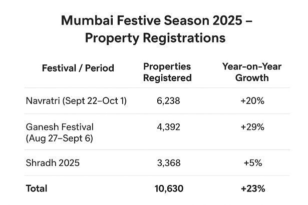 Mumbai’s residential real estate market experienced a notable uptick during the 2025 festive season, with a total of 10,630 property registrations recorded during Navratri and Ganesh Chaturthi. This reflects a 23% increase over the 8,604 registrations during the same period in 2024, according to data from the Maharashtra Inspector General of Registration (IGR) analysed by Knight Frank India.