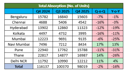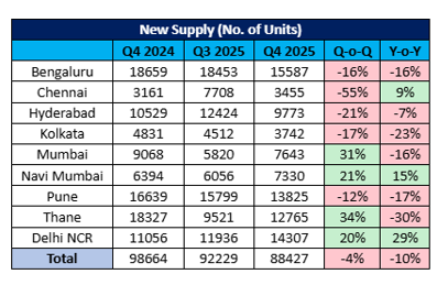 Housing supply fell 10% YoY to 88,427 units in Q4 2025 with only Delhi NCR (29%), Navi Mumbai (15%) and Chennai (9%) recording growth. Other 6 cities saw decline in supply up to 30%.