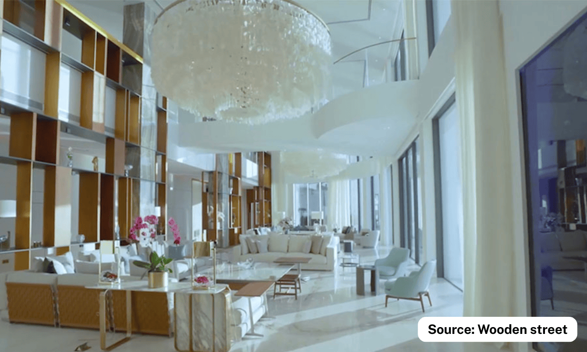 One of the most under-discussed aspects of Antilia is the way its internal structure is expressed through design. Cantilevered floors create the impression of floating platforms within double-height spaces. Internal bridges and staircases are designed as sculptural elements rather than purely functional ones, often using glass, stone, or metal with minimal visible support. Structural columns are concealed within art panels, carved stone forms, or mirrored surfaces, reducing the visual presence of load-bearing elements and making spaces feel more open.
