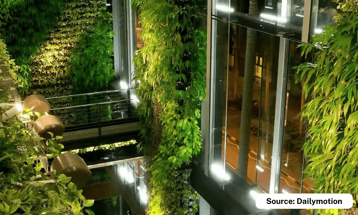 The gardens include a mix of tropical and native plant species such as palms, ficus, flowering shrubs, climbers, and groundcover plants chosen for shade, oxygen generation, and temperature control. This plant life is connected to the building’s environmental systems, helping cool the interiors naturally and filter incoming air.