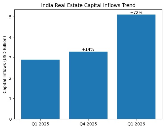 According to CBRE data, India’s real estate sector recorded $5.1 billion in inflows in Q1 2026, up 72% year-on-year