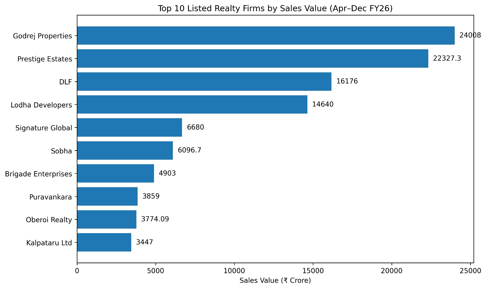 Top 10 Listed Realty Firms by Sales Value (Apr–Dec FY26)