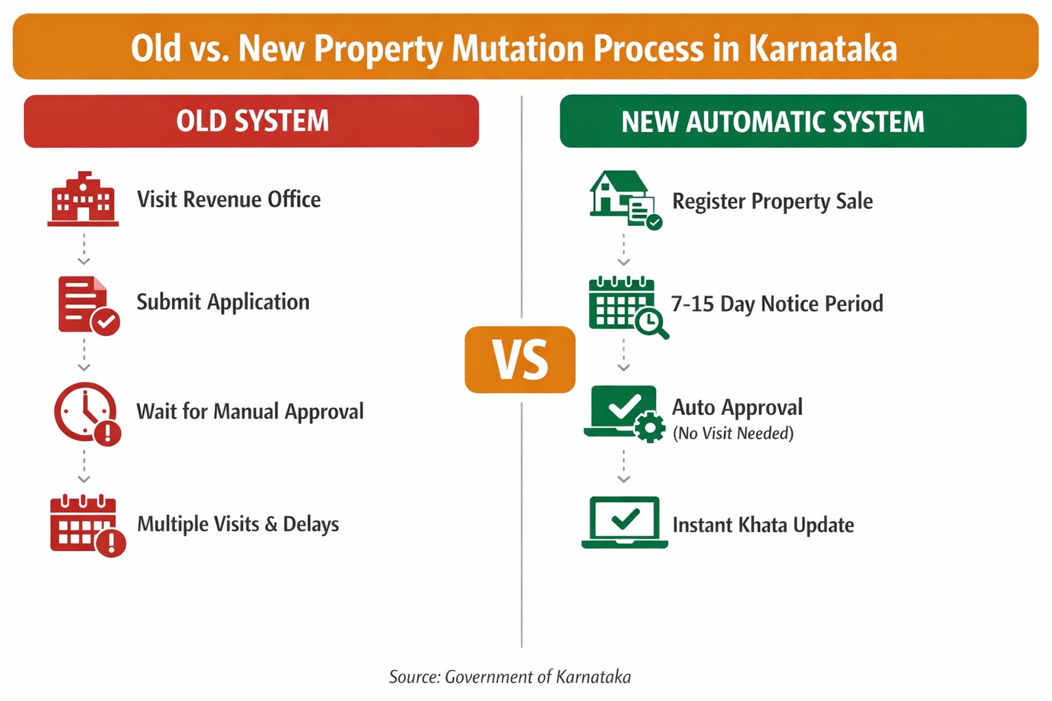 The government of Karnataka has rolled out an automatic property mutation system aimed at speeding up khata transfers and reducing the need for citizens to visit revenue offices. The reform is expected to automate nearly 98% of mutation cases, significantly shortening the time required to update ownership records after a property transaction.