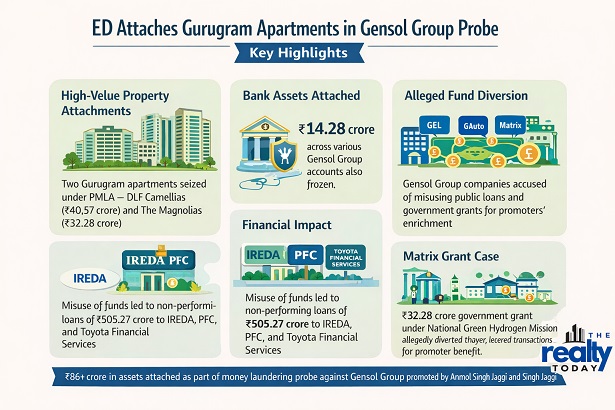In its ongoing money laundering probe against the Gensol Group, the ED has attached assets over ₹86 crore in value, including two high-value apartments in Gurugram. This group, promoted by the brothers - Anmol Singh Jaggi and Puneet Singh Jaggi - is being investigated for allegedly diverting public funds for enrichment purposes.