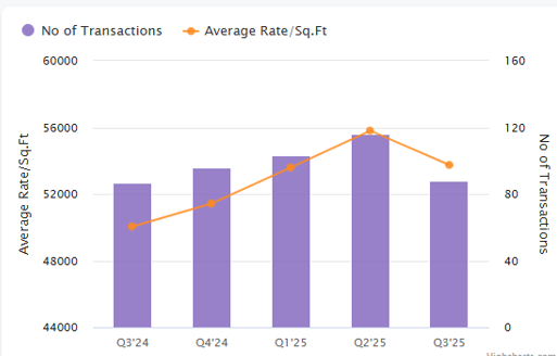 According to a report by Square Yard, Data Intelligence, the property rates in Khar West are presently among the highest in Mumbai. Sale prices, on average, stand at Rs. 38, 443 per sq.ft and rentals are around Rs. 132 per sq.ft. The market was relatively stable over the recent quarters, with a minor increase in early 2023. However, the number of transactions dropped in late 2022, which may be a sign of the market slowing down. Nevertheless, the locality experienced 205 sales transactions and a total sales value of Rs. 545 Crores during the past year, thereby indicating strong demand for premium properties.