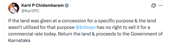 The controversy began when Congress MP Karti Chidambaram stated on social networking site X that land allocated to governments at concessional rates and meant for particular intentions cannot be sold commercially, failing which those specified intentions. As Infosys got this land at concessional rates, it must return both the land and the amount from the sale to the state government of Karnataka.