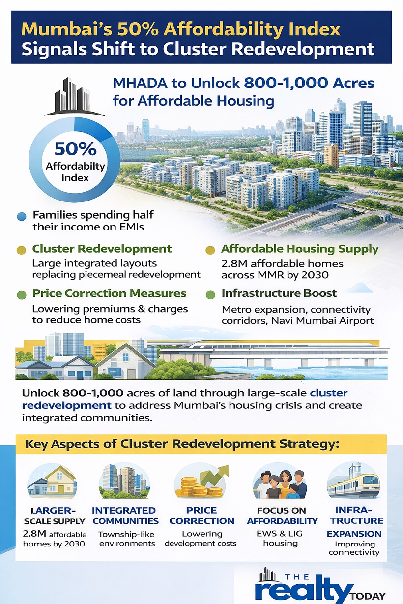 The challenge of housing affordability in Mumbai has come to a head as the city's affordability index has climbed to nearly 50%. This means that an average household is spending almost half of its income on home loan EMIs. On one hand, there is a shortage of land and, on the other hand, the existing building stock is getting older and the Maharashtra Housing and Area Development Authority (MHADA) has decided to focus on large, scale cluster redevelopment as a way of structurally addressing the city's deeply rooted housing problems.