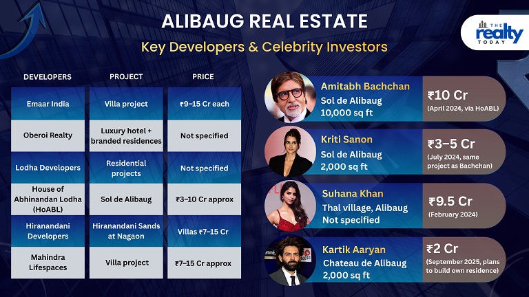 Five major developersEmaar India, Oberoi Realty, Lodha, Hiranandani, and Mahindra Lifespaces have come up with their projects here, which is a sign of the increasing popularity of Alibaug.