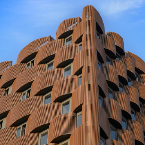 The Stella Office Building meets this issue with its layered, climate, responsive skin. The architects, instead of covering the whole building with glass, decided to wrap semicircular decks in aluminum louvers which were then introduced along the facade of the building. These curved projections are alternated from one floor to another thus providing not only depth but also shadow.