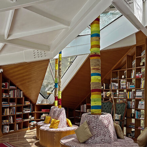 Art is not something that is added at the end at Eila, rather it's deeply woven into the architectural experience. The interiors, facades, and communal spaces under the art direction of Shri Rama Shankar Singh and Palak Singh not only depict a curatorial approach but also a way of life where art has been seamlessly embedded in daily living. Take the Kitaabkhana library, for instance, where the light filtered through jaali screens and custom lamps creates ever changing patterns; the open air amphitheatre and infinity pool, on the other hand, are oriented towards the horizon to keep the landscape visually connected.