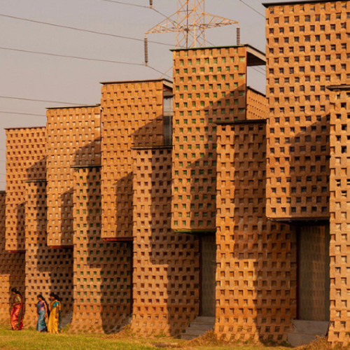 The compacted earth facade is shaped into a repeating recessed pattern, creating a porous surface that allows air to circulate while shading the steel structure beneath. This dual function reduces heat gain and minimizes reliance on mechanical cooling systems. The building leverages thermal mass, shadow, and ventilation rather than energy-intensive solutions.