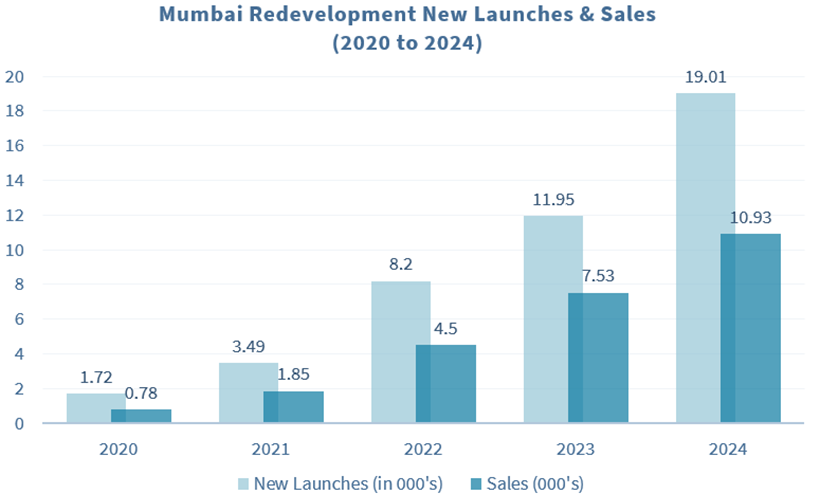 As per JLL report Since 2022, Mumbai’s residential redevelopment sector has surged, driven by land scarcity, ageing buildings, and rising demand for modern housing. Post-COVID data shows a 7x increase in new project launches and an 11x rise in sales value from 2020–21 to 2022–25, reflecting strong investor and buyer confidence. Suburban areas such as Vikhroli, Ghatkopar, Borivali, and Goregaon have been highly active, while core zones like Andheri, Bandra, Chembur, and Dadar are constrained due to older, smaller buildings, making redevelopment a key tool for unlocking housing supply in central locations.