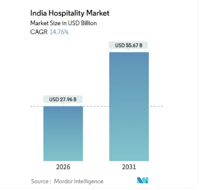As per Mordor Intelligence, the India hospitality market size reached USD 27.96 billion in 2026, and it is projected to reach USD 55.67 billion by 2031, registering a 14.76% CAGR over the forecast period. Growth is driven by a larger domestic travel base, a rising middle-income population, and improved air and road connectivity that increases travel frequency. Domestic visitor spending has been rising and is expected to continue, highlighting the sector’s reliance on local travelers across leisure, pilgrimage, and business segments.