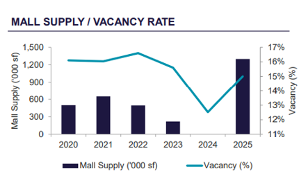 Retail leasing volume in 2025 stood at 2.25 msf – the highest since 2019 – registering 83% growth as compared to last year. Mainstreets accounted for 55% of annual leasing, while malls witnessed 45% of total space take-up. F&B led the space take-up in 2025 with a 22% share, followed by fashion (21%) and department store (14%) segments. Leasing by the F&B, entertainment and consumer durables segments has almost doubled in 2025 as compared to last year.