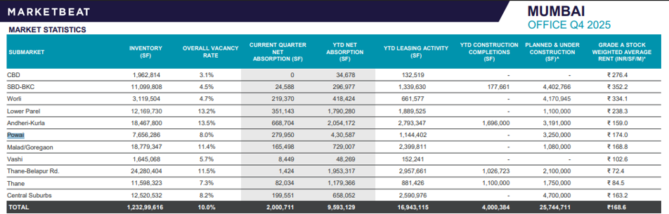 Grade A weighted average rents average ₹174 per sq ft per month, positioning Powai as a competitive mid-rent micro-market with good infrastructure, campus-style developments, and improving connectivity.