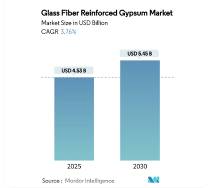 As per Mordar Intelligence report, the global Glass Fiber Reinforced Gypsum (GFRG) market is valued at USD 4.53 billion in 2025 and is forecast to reach USD 5.45 billion by 2030, growing at a CAGR of 3.76% during the forecast period. GFRG is increasingly adopted in modern construction due to its lightweight nature, superior fire resistance, durability, design flexibility, and faster installation compared to conventional gypsum boards and masonry systems.