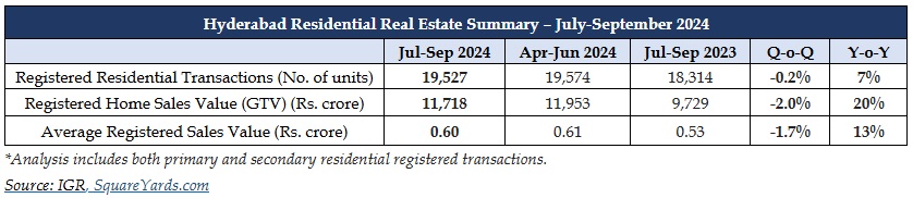 Hyderabad’s residential real estate market continues to demonstrate resilience, posting robust performance in the September quarter. Despite a slight sequential dip, the city recorded a 7% annual growth in registered residential transactions during the July-September 2024 period, as reported by Square Yards. A total of 19,527 transactions were recorded in the IGR, as compared to 18,314 in same period last year.