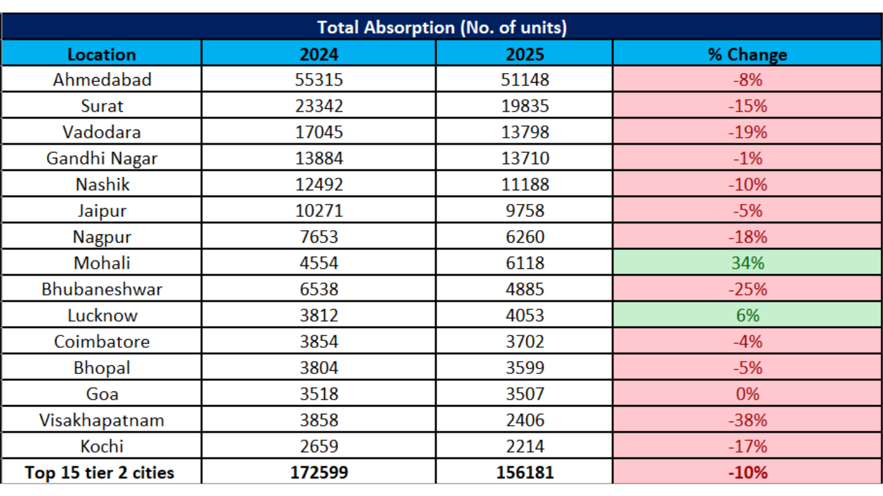 Jasuja added, "Government focus on tier-2 cities—through enhanced urban development, improved connectivity, and the creation of industrial corridors and manufacturing hubs-has driven sustained price appreciation. This has pushed even average housing units in many tier-2 markets beyond the ₹1 crore mark, leading to slower absorption. Going forward, this trend could be a cause for concern, as affordability pressures begin to impact not just premium segments but also affordable and mid-income housing in these cities."