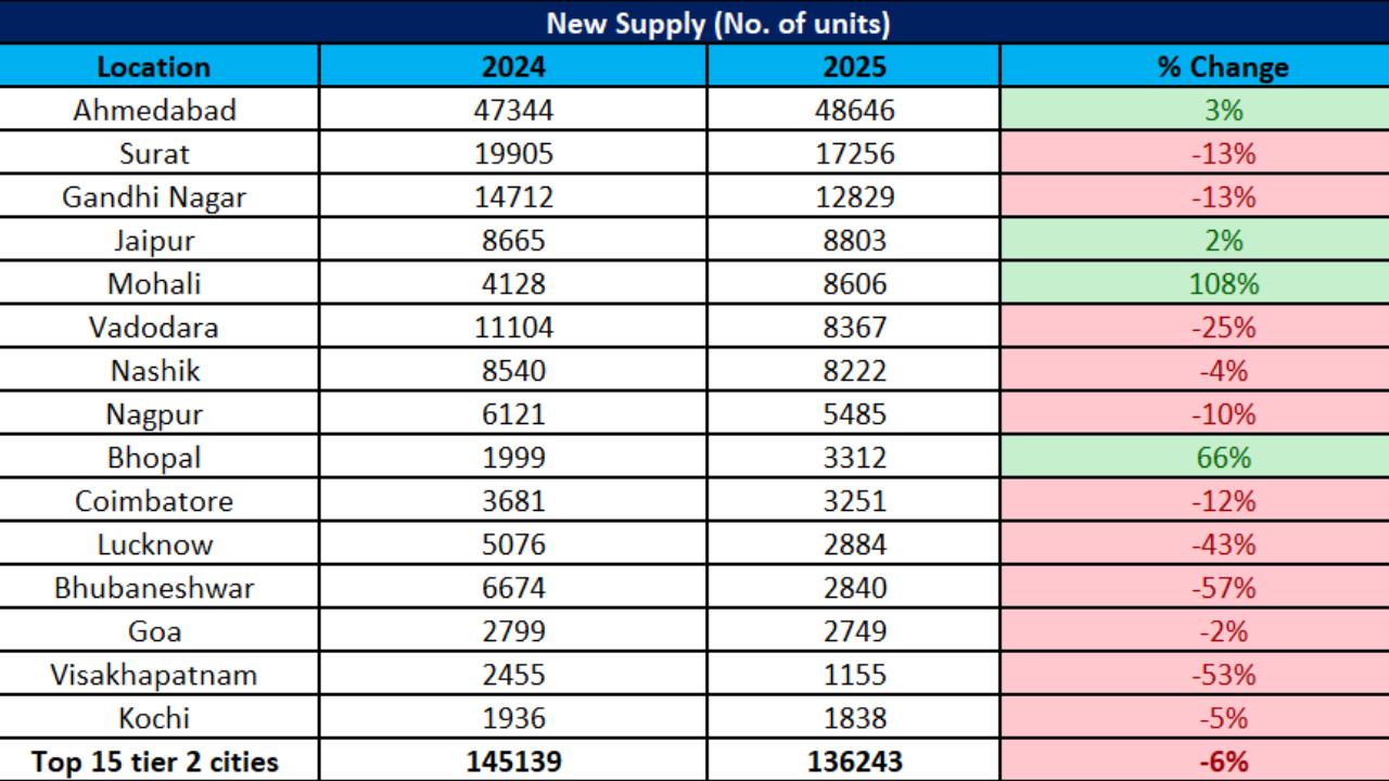 New supply across the top 15 tier-2 cities declined by 6% to 1,36,243 units in 2025, down from 1,45,139 units in 2024. The contraction was seen across price segments, with supply of homes priced under ₹1 crore declining by 5%, and those above ₹1 crore falling by 8%.