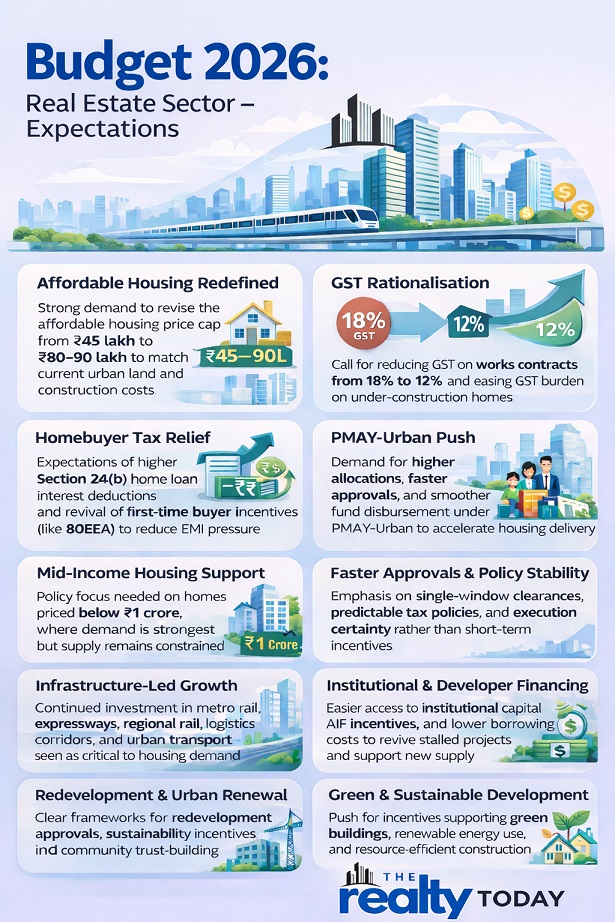 - Real estate sector seeks policy support in Budget 2026 to address housing affordability, rising construction costs, and shifting urban demand.