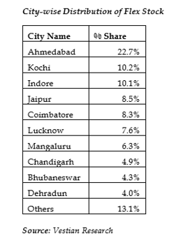 Capitalising on the growing allure of Tier-2 cities, flex operators are consistently expanding. As per Vestian’s latest report, Tier 2 cities accounted for over 575 centres and 8.8 Mn sq ft of flex stock, representing nearly 29% of the nation’s total flex centers and over 9% of pan-India flex stock.