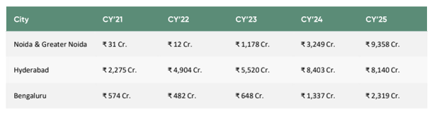 - Dwarka Expressway recorded 2,079% growth in transaction value (₹383 crore to ₹8,347 crore).