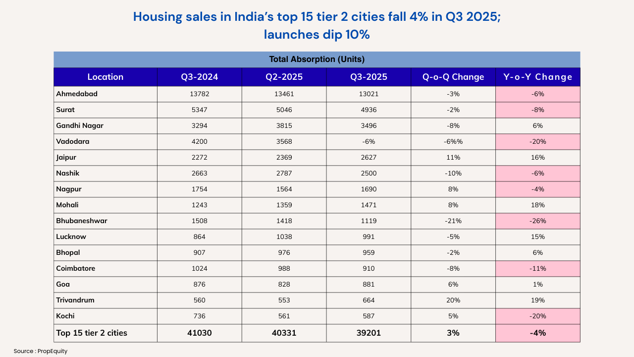 Housing sales in India’s top 15 tier 2 cities fell 4% YoY to 39,201 units in Q3 2025 even as the sales value rose by 4% to Rs 37,409 crore indicating a gradual shift towards premium homes, according to a report by NSE-listed real estate data analytics firm PropEquity.
