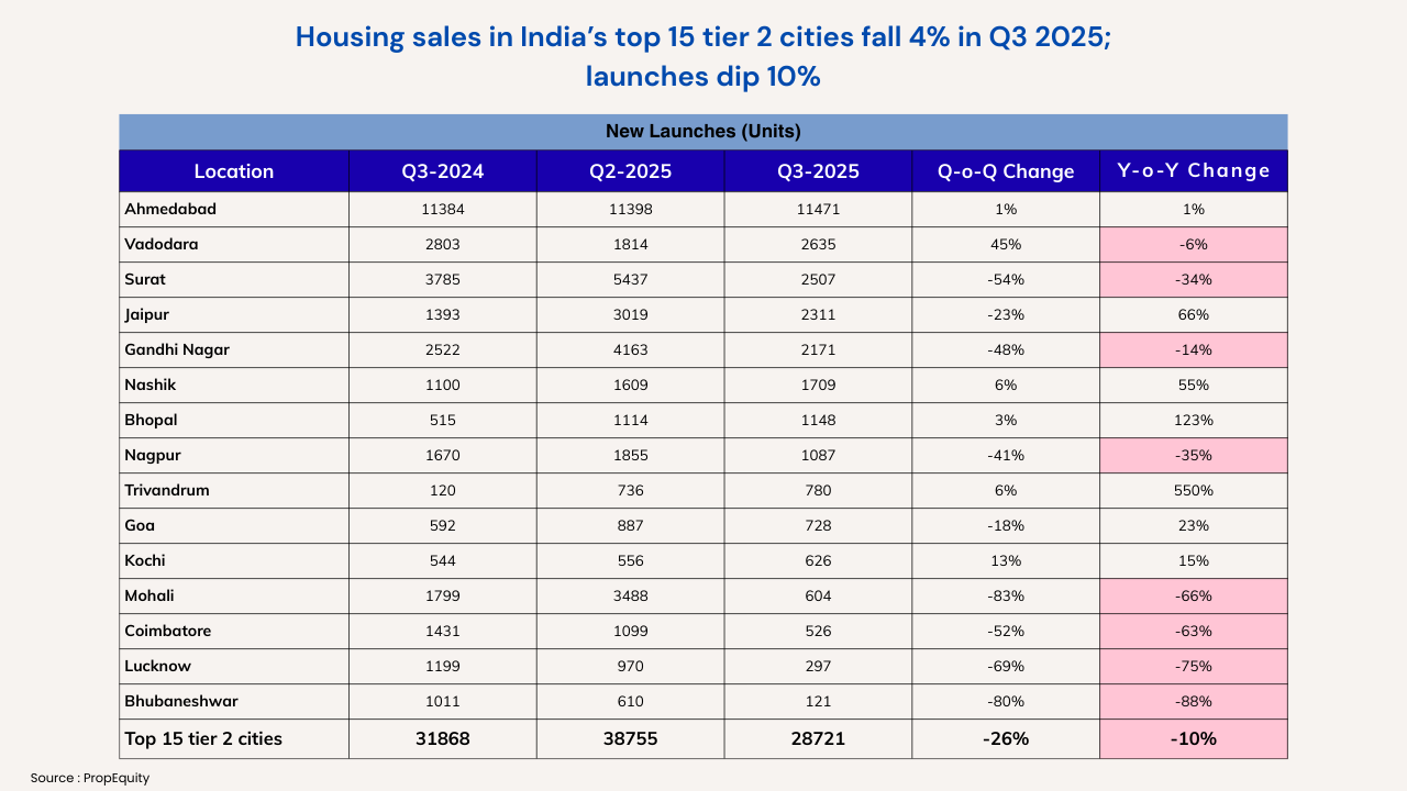 Compared to the previous quarter, Q3 2025, housing sales fell by 3%, sales value was down by 1%, and launches went down significantly by 26%.