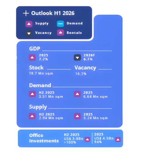 During H1 2026, both demand and supply are expected to remain strong, underpinned by strong occupier expansion and preference for high-quality, future-ready office spaces. At the same time, as vacancy tightens in prime locations and supply remains uneven, occupiers are likely to become more deliberate, selective and competitive in their real estate decisions.