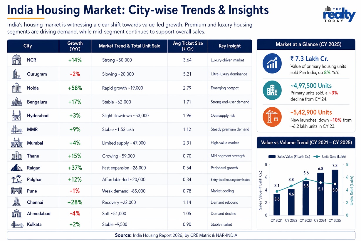 - Gurugram has continued to remain the center of ultra-luxury real estate with an average ticket size of ₹5.21 crore. Yet the marginal decrease in growth rates signifies a consolidation phase after fast growth.