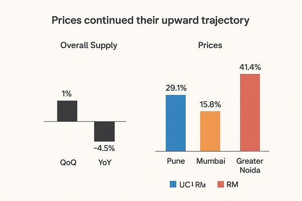 While overall supply grew just 1% QoQ (–4.5% YoY), prices continued their upward trajectory. Pune (+41.4% YoY), Mumbai (+29.6% YoY), and Greater Noida (+27.3% YoY) recorded the sharpest annual price appreciation, driven by resilient demand and limited new launches. Notably, under-construction homes commanded a higher premium than ready-to-move units, with UC prices in Pune rising +29.1% QoQ compared to +15.8% for RM homes.