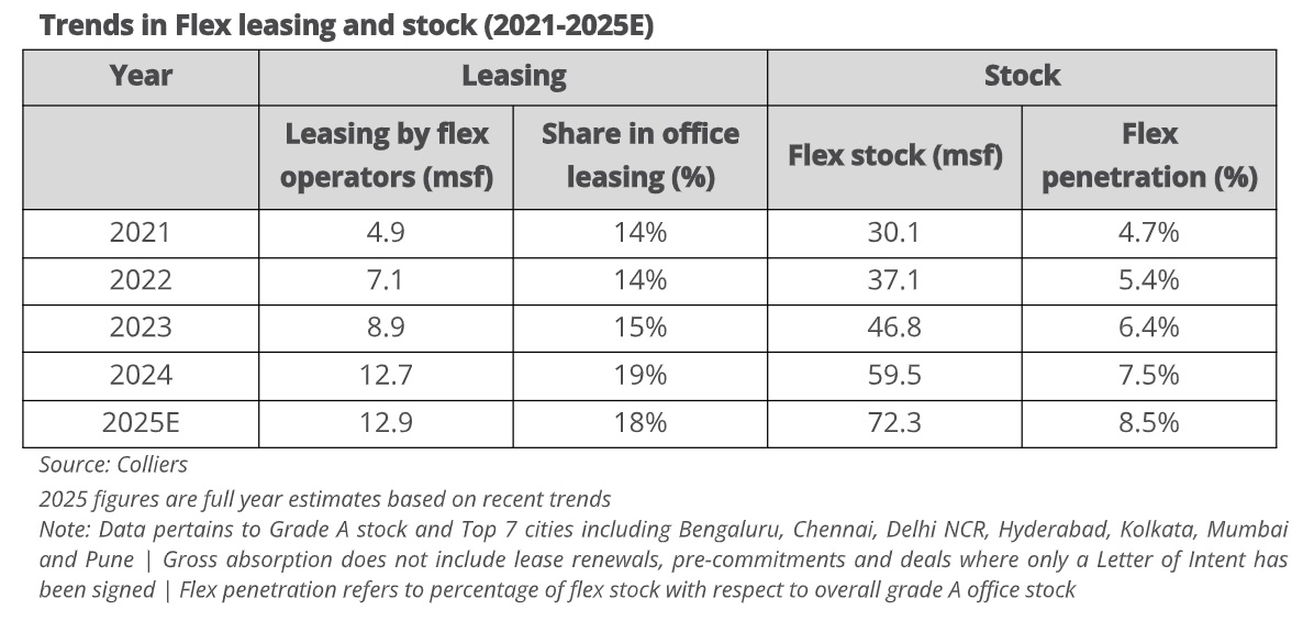 “India’s flex market is entering a pivotal era of expansion, with Grade A stock set to surpass 100 million square feet by 2027, growing annually by nearly 20% across the top 7 cities. As domestic enterprises and global firms, especially Global Capability Centers (GCCs) deepen their flex adoption, operators are responding by curating next-generation, customized workspaces adept with advanced PropTech and sustainable features. The flex market momentum is further being bolstered by growing number of operators raising capital through IPOs, signaling strong investor confidence. Overall, the next phase of India’s flex market will be driven by the growth of technology firms, the expansion of GCCs, changing expectations of occupiers and increasing appetite of institutional investors.”, says Arpit Mehrotra, Managing Director, Office Services, Colliers India.