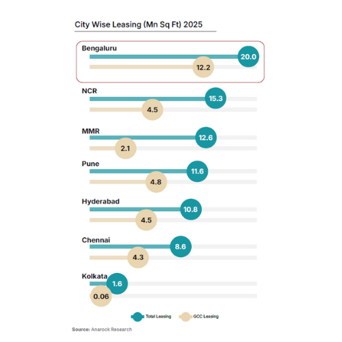 - Top seven cities recorded 80.5 million sq ft leased in 2025, with GCCs accounting for 32.5 million sq ft; Grade A office stock now ~800 million sq ft.