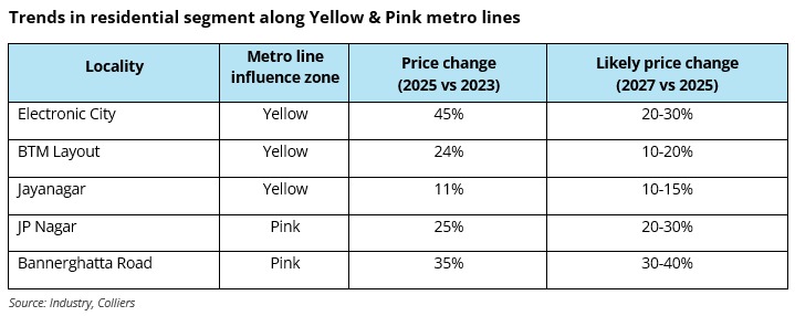 “The impact of metro connectivity is clearly visible in the Bengaluru residential market, particularly along the Yellow and Pink Line corridors. The operational Yellow Line has significantly improved access to South Bengaluru, driving up housing prices by almost 45% in locations such as Electronic City. At the same time, residential catchment areas along the Pink Line, including Bannerghatta Road and JP Nagar, are witnessing strong demand surge, especially in the middle-income and luxury segment. Overall, the Pink Line is likely to improve connectivity significantly and will have a positive domino effect on the housing market as well as office, retail & hospitality segments over the next few years.” said Vimal Nadar, National Director and Head of Research, Colliers India.