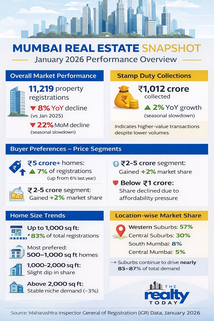 The residential real estate market in Mumbai witnessed a mixed scene at the beginning of 2026. On the one hand, there was a short term weakening in transaction activities. On the other hand, property prices held up well. Data for January 2026 released by the Maharashtra Inspector General of Registration (IGR) indicates that the city had 11, 219 property registrations during the month, which is 8% lesser on a year on year basis than January 2025.